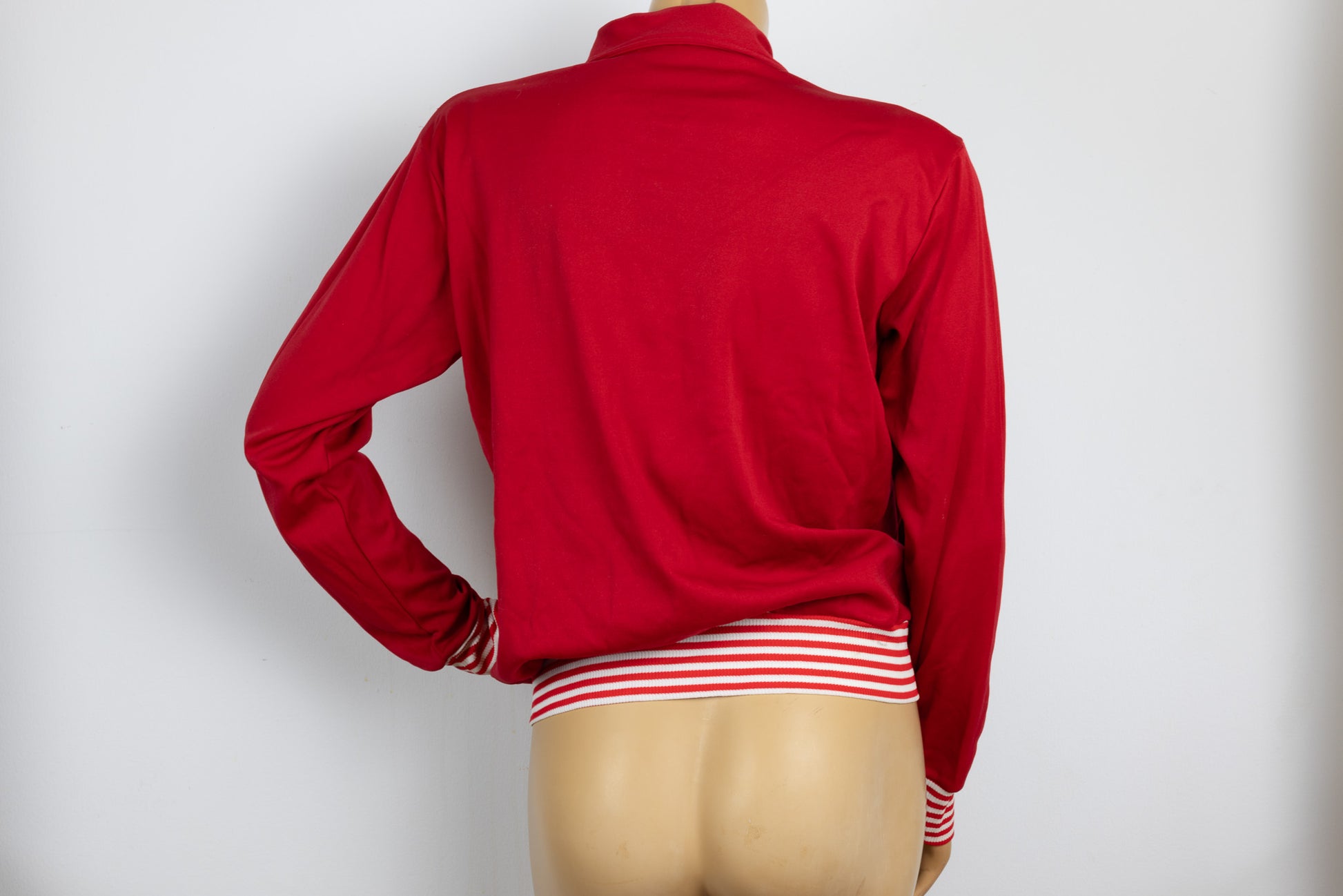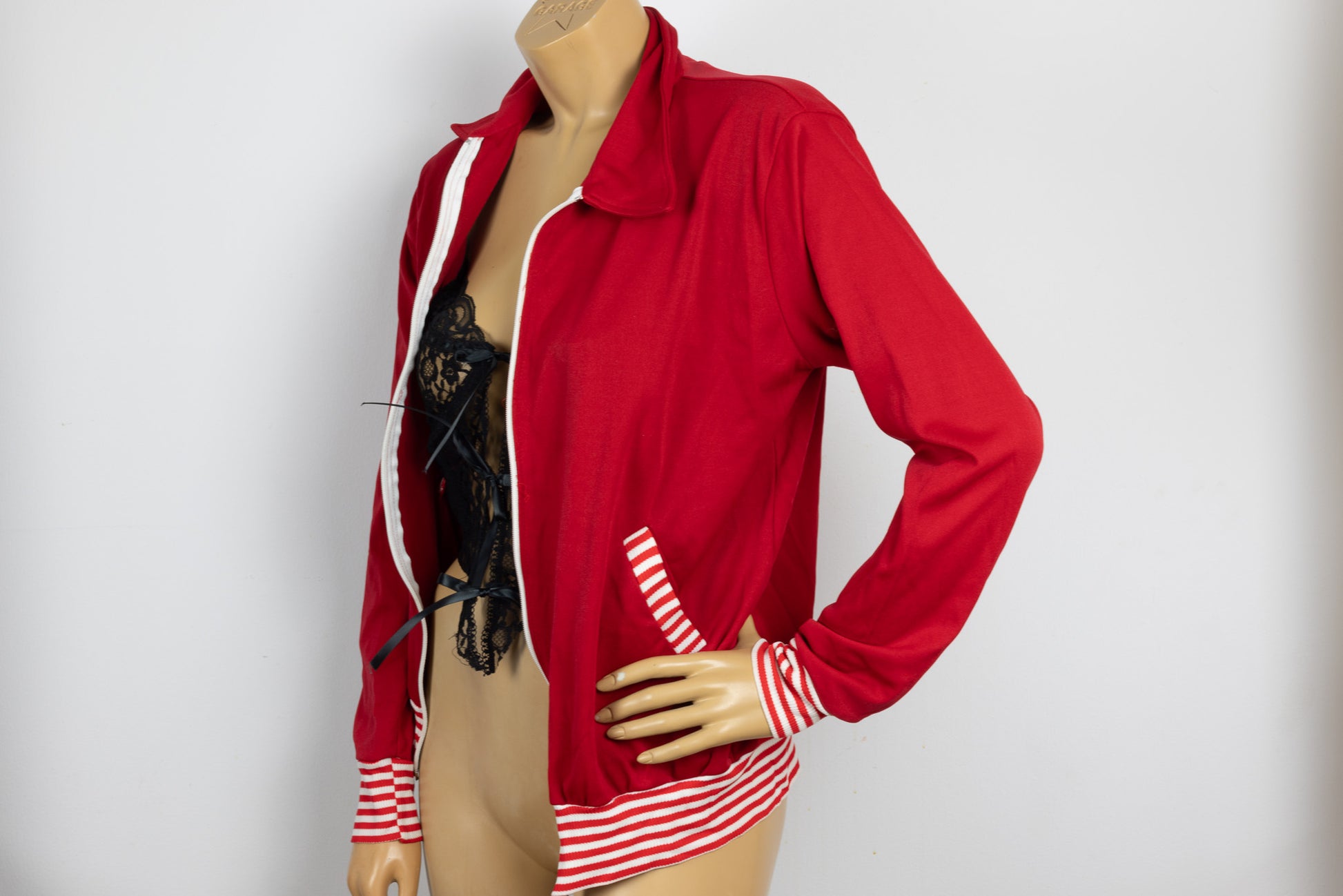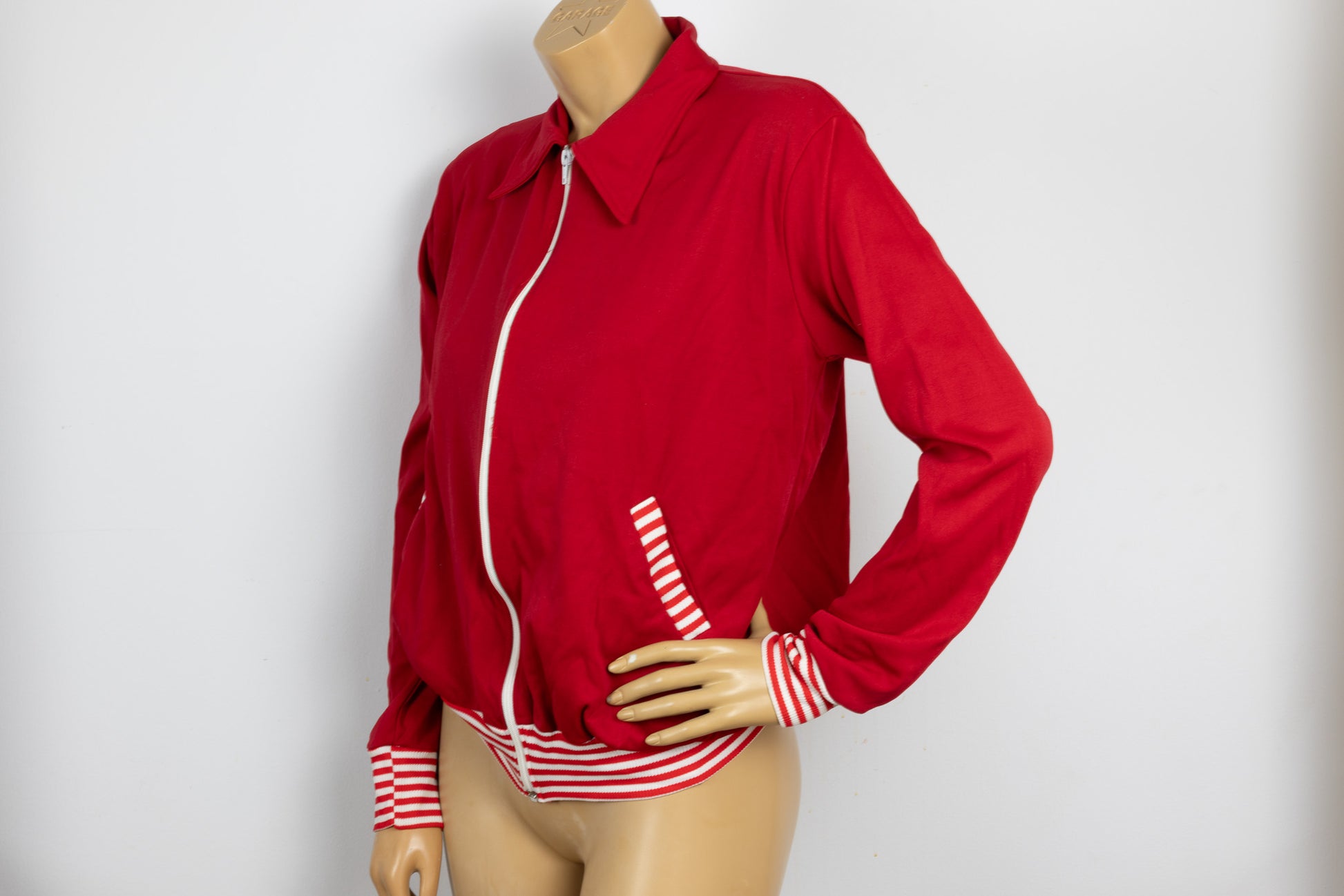 70's red zip up track jacket with stripped accents tagged size large